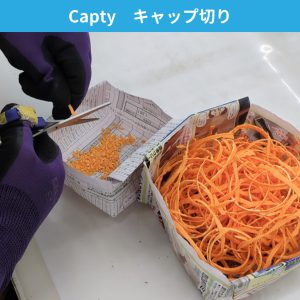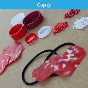 Capty(キャプティ) ペットボトルキャップを再利用した製品 ・キャップ仕分け、洗い ・キャップ切り(大きく切る、細かく切る) ・アイロンで溶かす